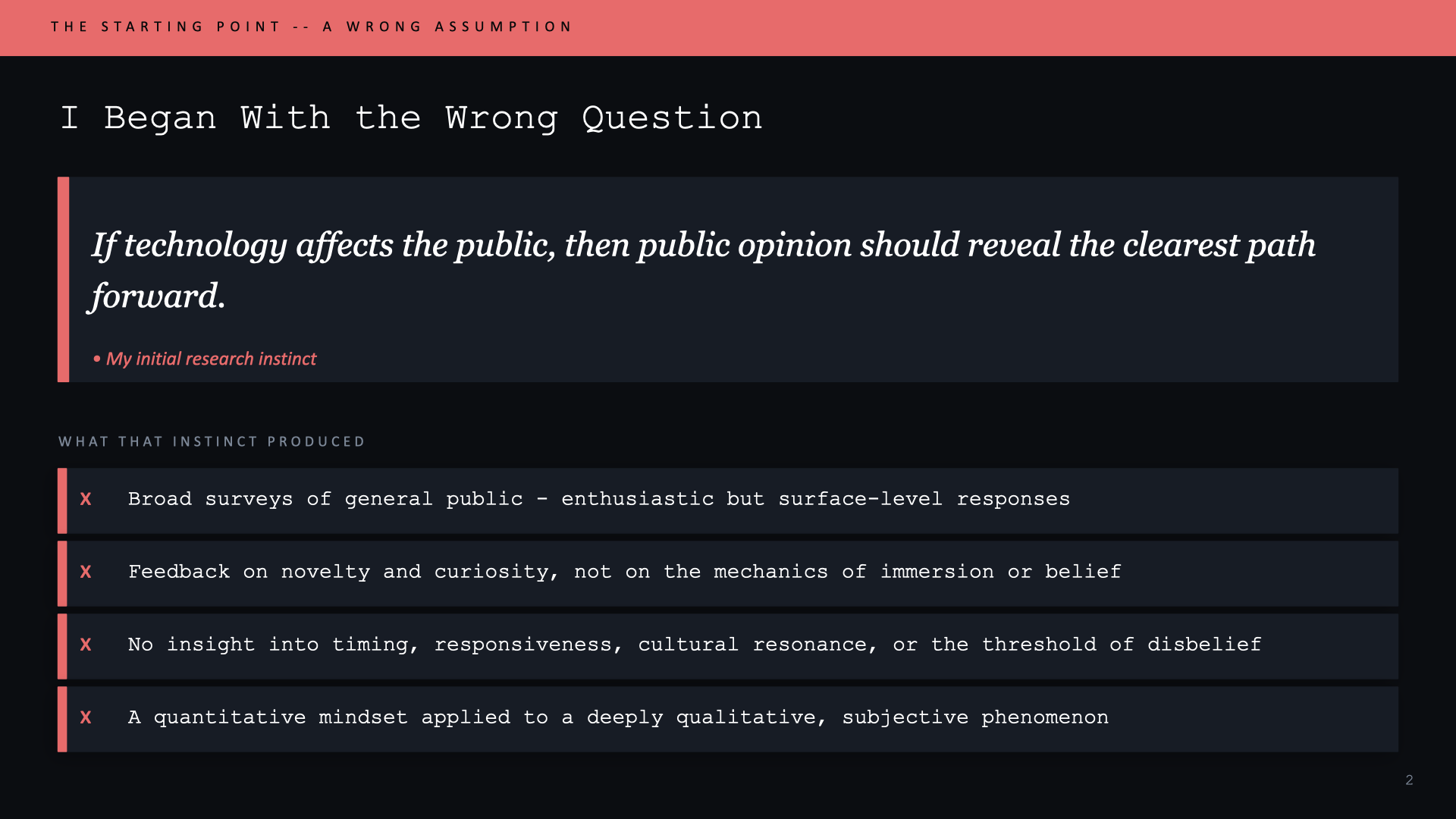 “I began with the wrong question. My initial assumption was that if technology affects the public, then public opinion would reveal the clearest path forward. That instinct led me towards broad public surveying and a more conventional research model.