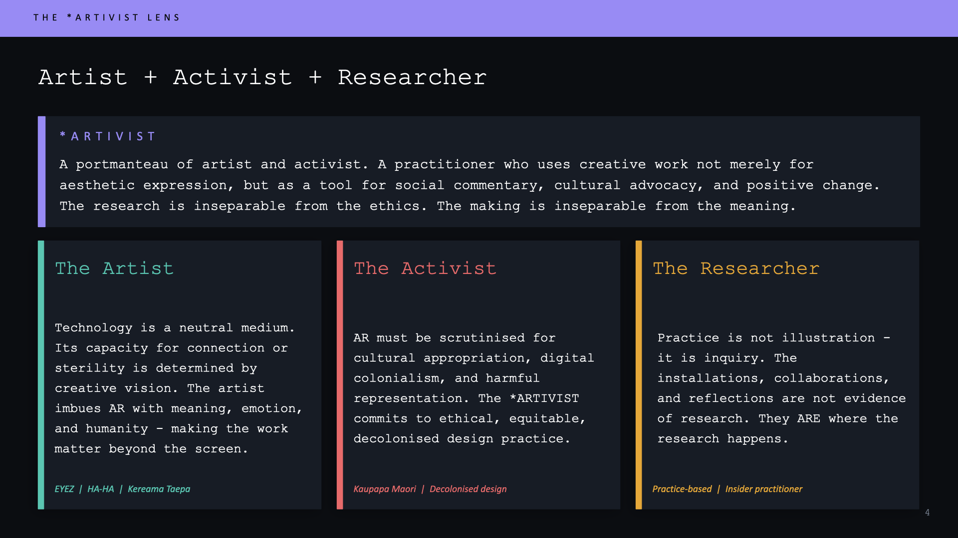 As an activist, I argue that AR cannot be separated from ethics. It must be examined for appropriation, digital colonialism and harmful representation. That is why kaupapa Māori and decolonised design are structural, not decorative, in this work.