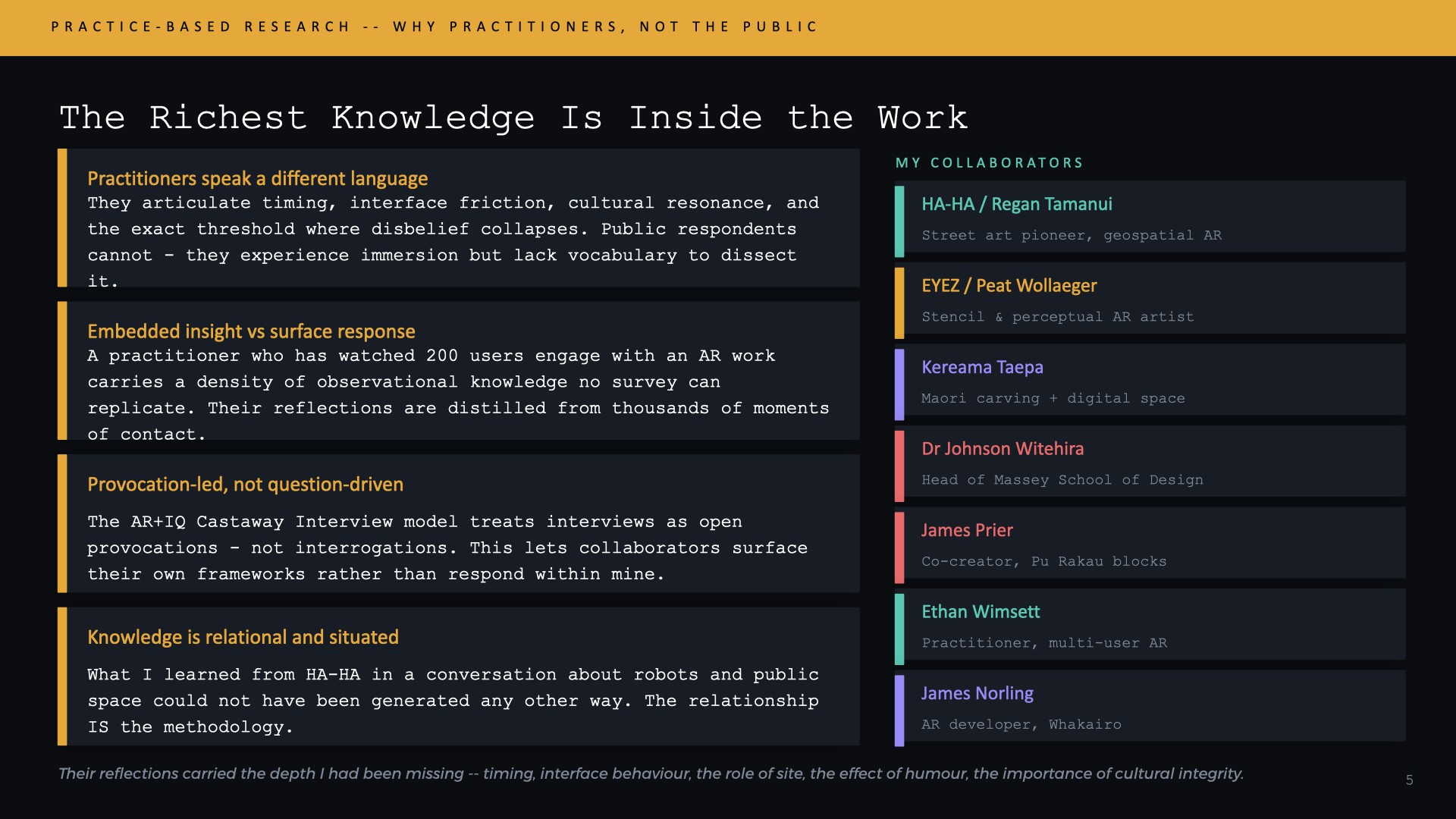 “The richest knowledge turned out to be inside the work. Practitioners speak a different language. They can articulate the precise moment where an AR experience becomes believable, and the exact conditions under which that belief fails.