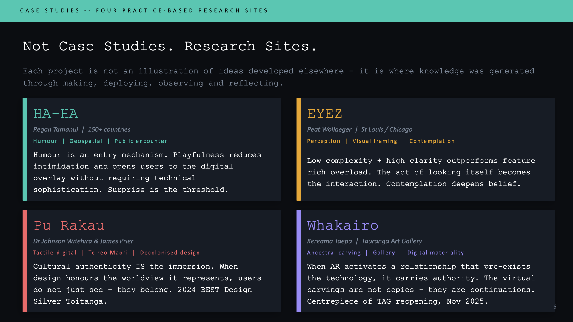 Whakairo showed that when AR extends a relationship that already exists culturally and spatially, the work carries authority. The virtual carving is not experienced as a copy, but as a continuation.”