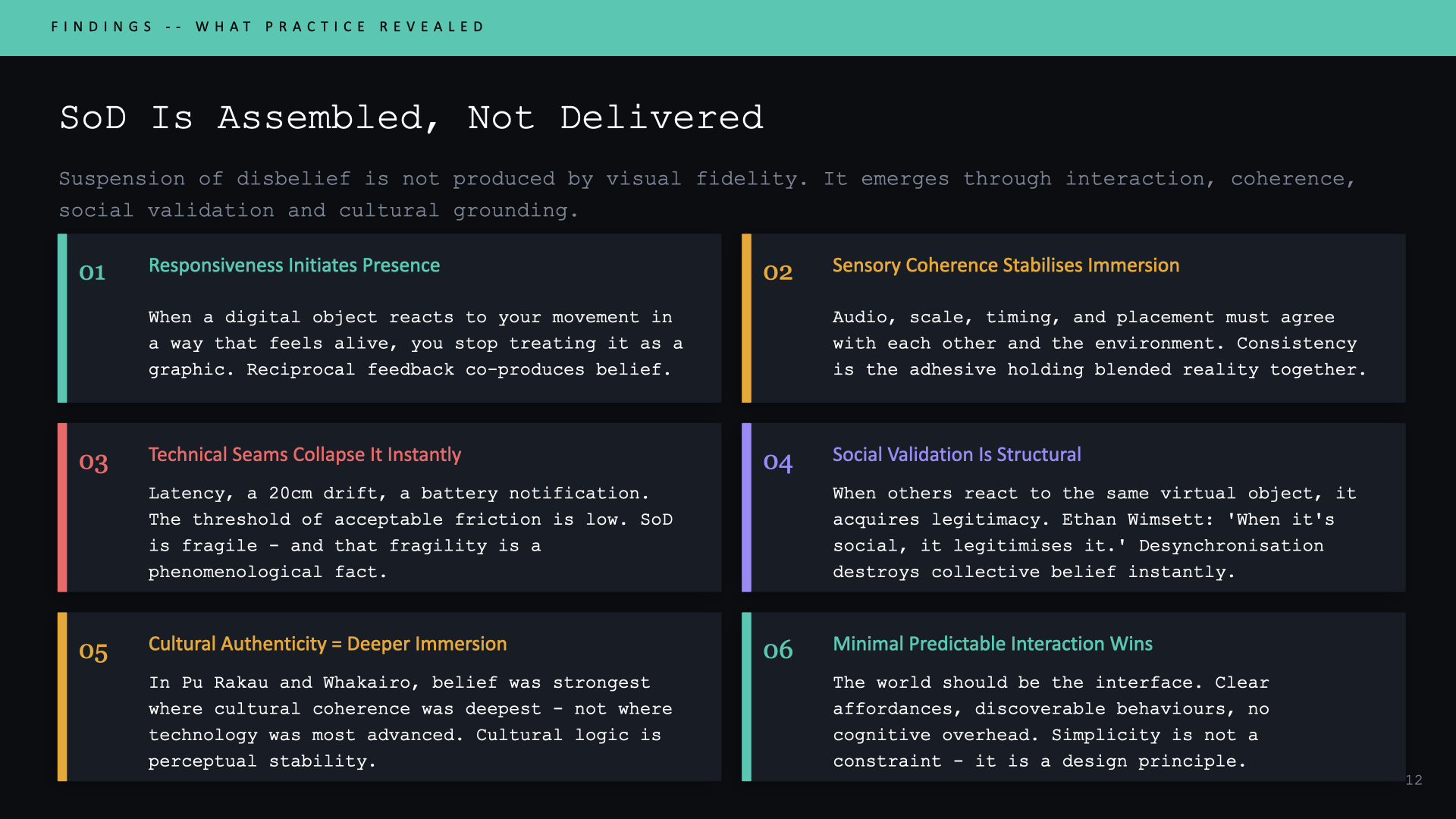 Pū Rākau demonstrated that tactile-digital design and cultural authenticity can deepen immersion. In that project, the physical object anchors belief before the digital layer even begins.