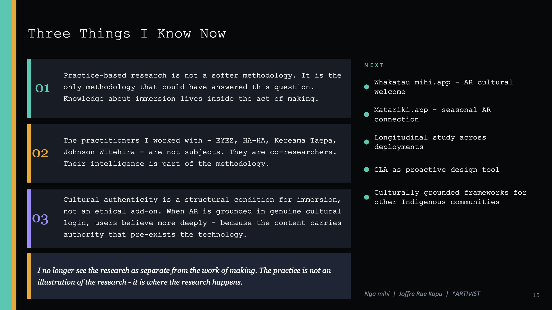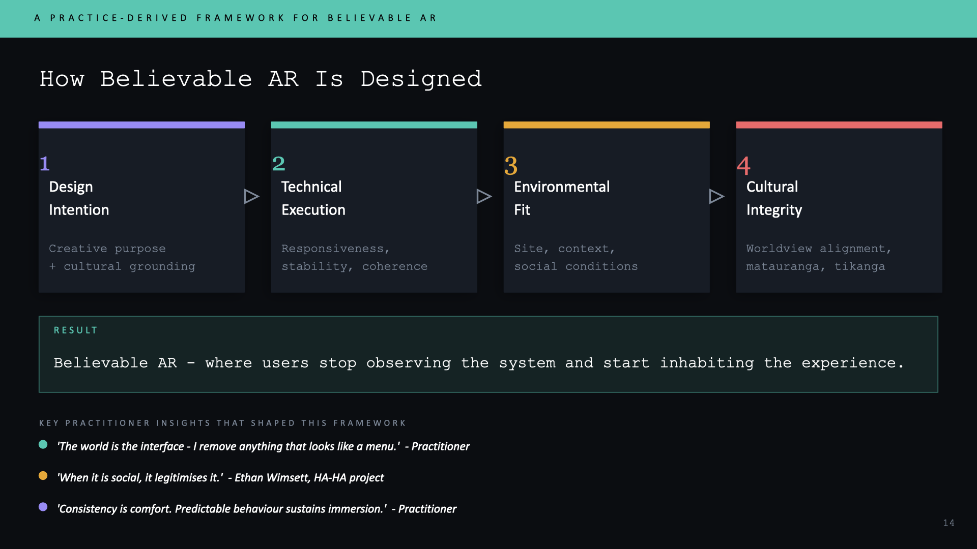 “Tēnā koutou katoa. This presentation outlines how my research shifted from broad public opinion towards practice-based insight, and how that shift revealed a clearer framework for designing believable AR.”