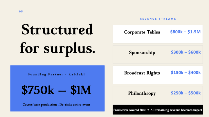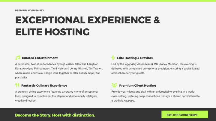 Performances, staging, screen content and artistic transitions should feel purposeful and carefully held, honouring the gravity of the kaupapa while still offering beauty, hope and a compelling sense of possibility.
